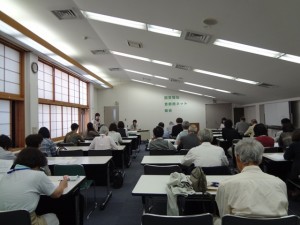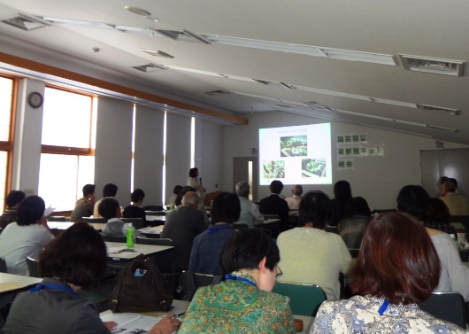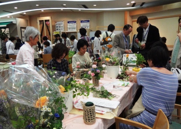 5月27日、事例発表のあと、会場を1階のロビーに変えて、午後2時過ぎから始まった「第5回集まれ首都圏!園芸福祉見本市」は新作のクラフトの発表会でもありピーク時には祭りのような賑わい。4時過ぎまでの約2時間、杉並リボン館のロビーには、花やハーブの香りに満ち溢れていました。一般参加もふくめ67名の参加がありました。