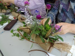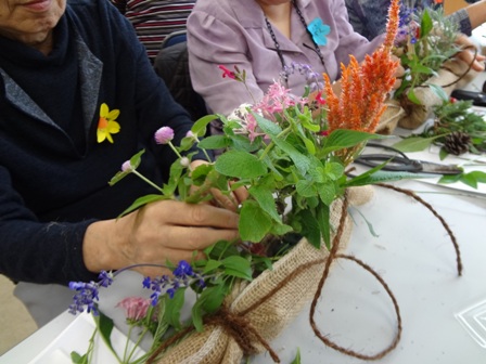 後半はペットボトルを使った花器づくりクラフトを楽しみました。浜町公園の「ふれあい花壇」で、思い思いの花を切ってフラワーアレンジに挑戦。ペットボトル全体は、樹木の養生用の麻布でくるみ、両端はシュロ縄でキャンディ包紙のように・・・
