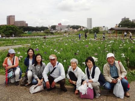 江戸川の土手を越えると、一面に花菖蒲田が広がっていた。どんより曇った空の下に、何万匹の蝶が舞うようかような光景。敷地面積約1万9千平方㍍。菖蒲田のほか、湿生植物池もある(ムジナモ発見の地の碑も)「ここは、どこより手入れの良い菖蒲園なのですよ」と、常連の老夫婦。「花菖蒲は、雨に濡れると、さらに美しいという。いま七分咲きですね」。ここでは100品種、花の数5万本を見ることができる。