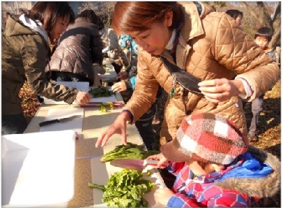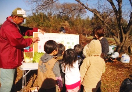 川越駅よりバスで揺られながら約20分。晴れの日は富士山が見える。すでに地元メンバーの方が準備におわれている。今日の予定は、焼き芋、すいとん作り、そして3回シリーズ最終会の「食育教育」。 12月14日、10時ごろ親子ずれが大きな荷物を持ちピクニック気分でやって来た。早速料理にとりかかる。子供達が包丁を片手に大根・ニンジン・ゴボウ・ホウレンソー、キャベツ・等の野菜を切る。はら、はら、しながら見守るパパ・ママたち。