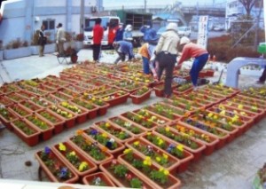 ③藤井康隆さん(千葉)は、まだ連絡もままならない被災1ヶ月後の4月に、所属する花の企画社社長とトラックに7000ポットの花苗や、野菜、日用品などを積んで宮古市へ飛んだ。市長はじめ現地の人々と駅前花壇に稙栽、復興を誓った。長嶋茂雄氏の応援メッセージも携え、喜ばれた。